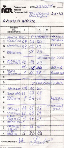 quadrupla traversata dello Stretto nei quattro stili, In attesa di completare la pagina con le foto realizzate da Marcello Aricò, pubblichiamo il racconto dello stesso Alberto. Per un errore di compilazione dei dati ufficiali, Guerrini e con lui i cronometristi, la stampa e lo stesso Baiadigrotta.it hanno ritenuto il suo risultato (5 ore, 24'29") il nuovo record, migliore del tempo di Gianni Golini. Il risultato è stato poi ridimensionato (nel tempo ma non nella sostanza dell'impresa) grazie alle dettagliate e documentate correzioni segnalate da Pasquale Nucara e Franco Di Fede. Quindi il record resta a Golini, ma la bella impresa di Alberto resta tutta. Se possibile, ancora più esaltata dalla esemplare sportività con cui ha preso la notizia delle rettifiche. Sotto trovate, prima del suo racconto della traversata, la sua risposta alla notizia del mancato record, che pubblico con il suo permesso e che ritengo un grande esempio di signorilità e correttezza. 7 Novembre