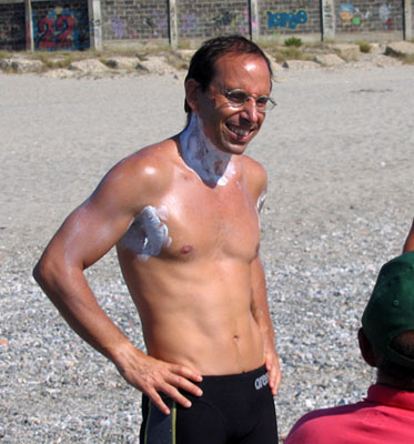 In questo caso la felicità ha prevalso nettamente sul disappunto, visto lo spirito profondamente sportivo con cui Pietro ha affrontato la traversata. Ha dato tutto, vivendo l'evento come una grande emozione che sarebbe in ogni caso rimasta. L'impressione che personalmente ho avuto, stando in barca al suo fianco e conoscendo la sua nuotata bella e nervosa, è che abbia un po' pagato la mancanza di esperienza su distanze medio-lunghe, facendo un po' di fatica a trovare un ritmo costante, procedendo piuttosto con un susseguirsi di accelerazioni e pause.