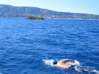 In barca al suo fianco era anche presente l'allenatore Antonio Arena, che ha seguito la sua preparazione. Lo staff era completato dal medico dott. Marcello Aricò e dai cronometristi Parasporo e Scimone, oltre a Giovanni ed Antonio Fiannacca ed al vostro cronista, oggi in veste di "responsabile della traversata". Nino Fazio